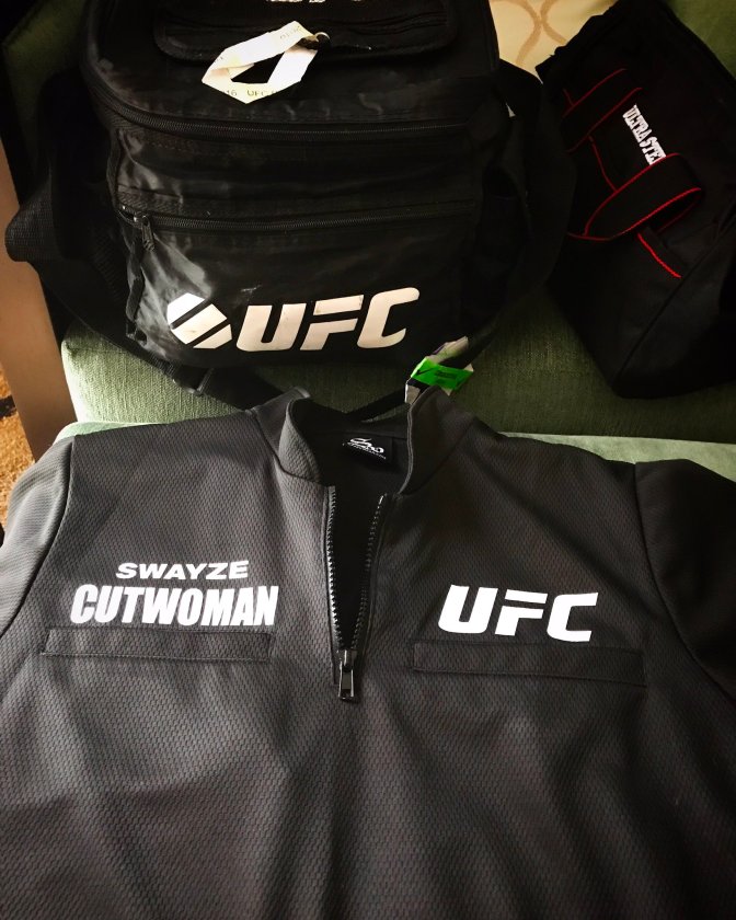 There is one situation that sticks out in my mind. I was working a televised event in Kansas City, Missouri. My fighter won the round by submission. His win didn’t go without receiving some damage! I went in to clean him up before his post-fight interview with the cage announcer. While the announcer was standing next to us with his mic on, the fighter says to me into the mic, “You are so beautiful, wanna go out tonight?!” I turned 50 shades of red, I was caught so off guard, I just smiled and made a quick exit. Haha! It was very sweet and flattering.